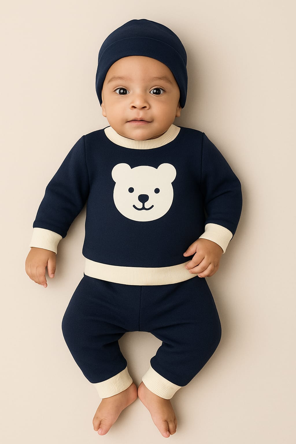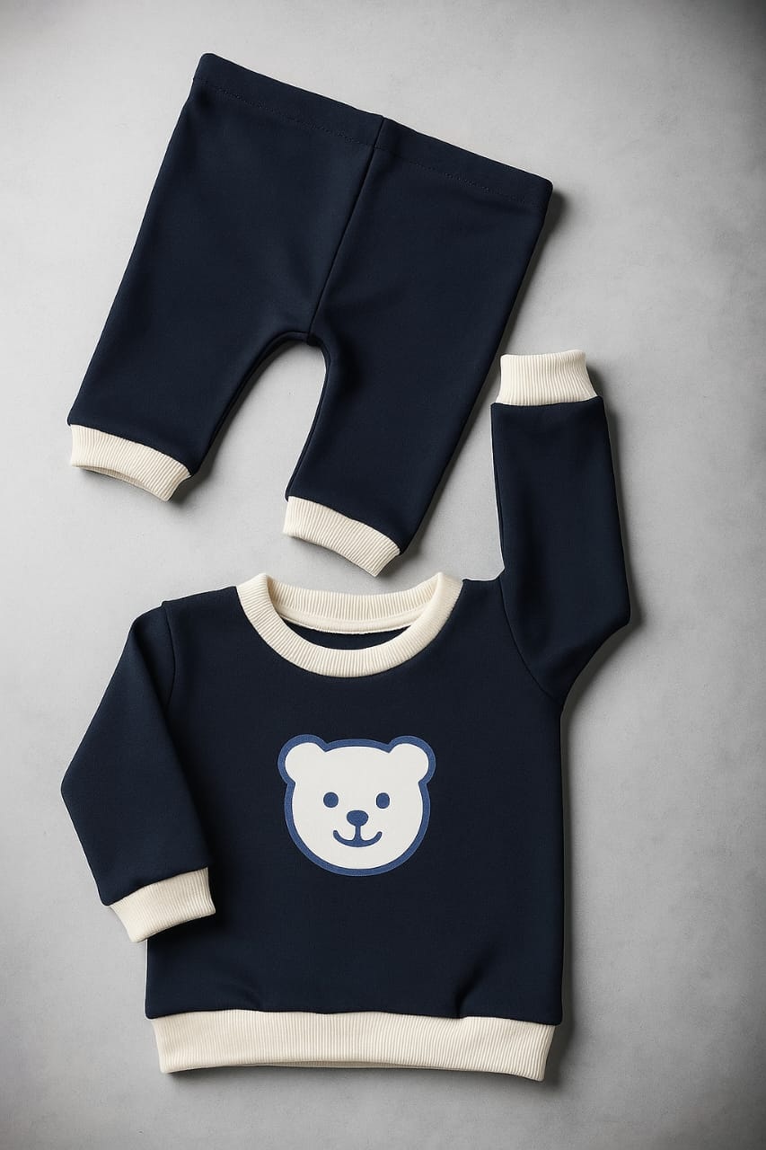 Keep your little one cozy and stylish with our Navy Blue Bear Sweatshirt & Trouser Set โ€” made from premium organic cotton fleece thatโ€™s gentle on your babyโ€™s delicate skin. The soft fabric ensures comfort all day long, while the cute bear print adds a playful touch to your babyโ€™s wardrobe.